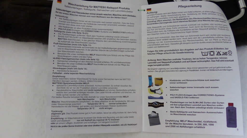 Bei täglichem Gebrauch und je nachdem wie stark das Pferd schwitzt, sollten die Bachgurte alle 1-2 Wochen mit Lammfellwaschmittel gewaschen werden.