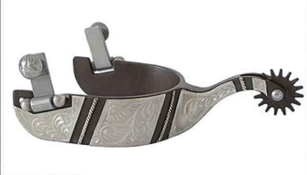 Schicke schwere Antique brown Sporenausführung für Männer. Der Sporenhals ist nach oben geschwungen. Außerdem hat dieser Sporen eine feine und detaillierte Zier-Applikationen mit Rope und Silver. Das Rädchen lässt sich tauschen, wenn man die Achse aufflext.
