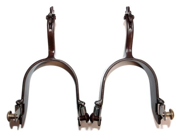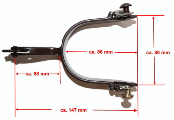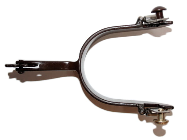 Schöne, schwere Westernsporen für Männer mit Flower Gravierung und 9 Point Rowell. Diese Sporen sind dunkelbraun und haben eine Schenkelweite/Öffnung von ca 8cm bei einer Höhe von ca 3cm. Das Rädchen ist geschweißt und lässt sich nur wechseln, wenn man dies aufflext und dann mit Splinten plus Achsen arbeitet. Der Sporenhals inkl Rädchen hat ca 7cm