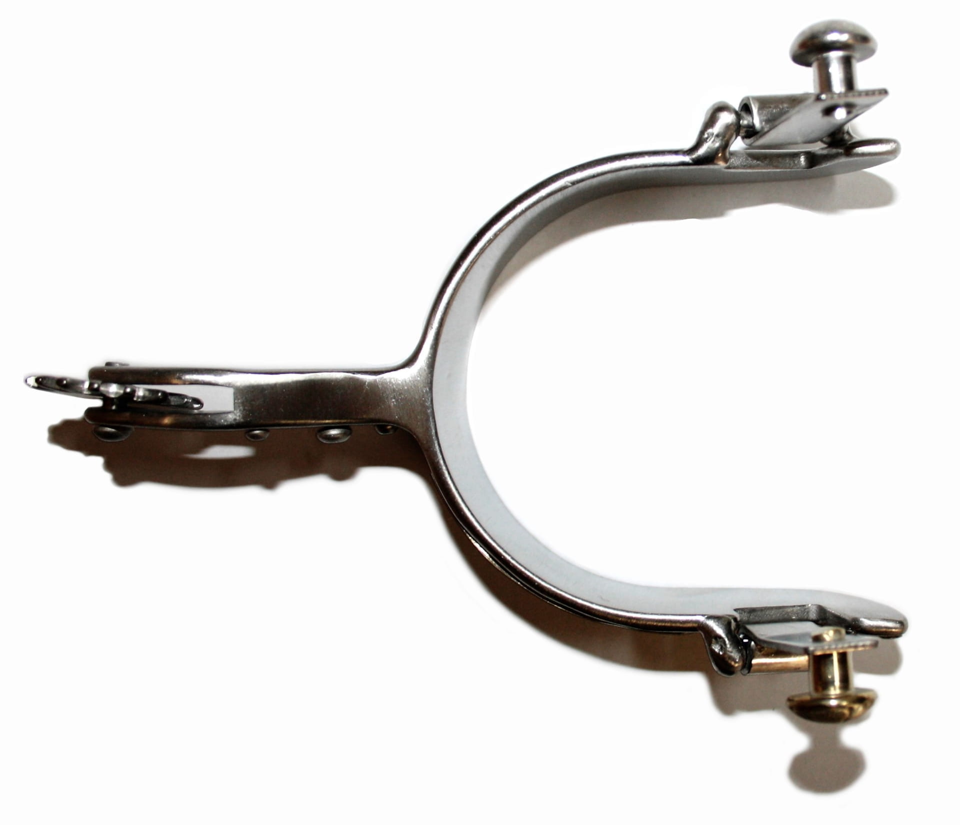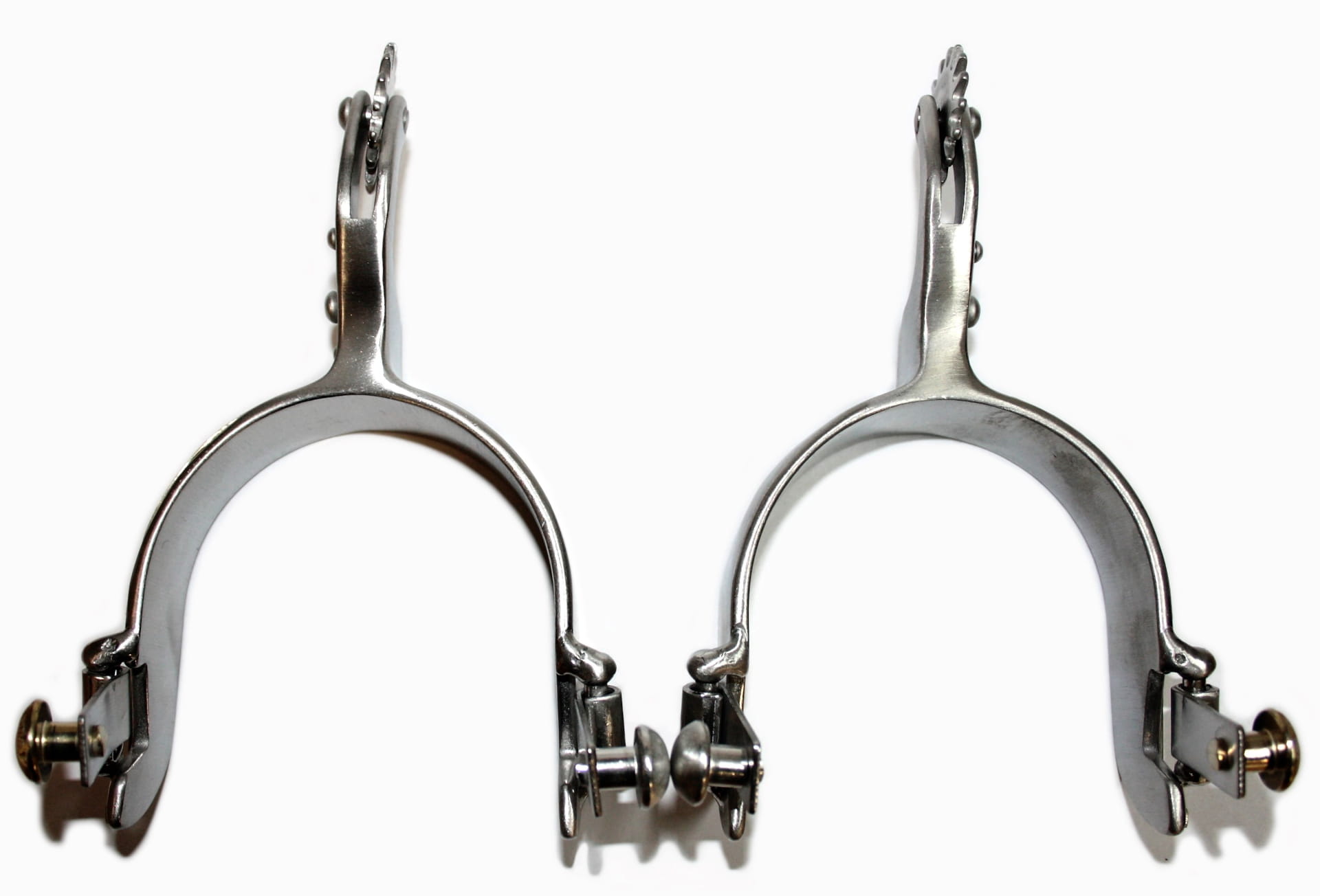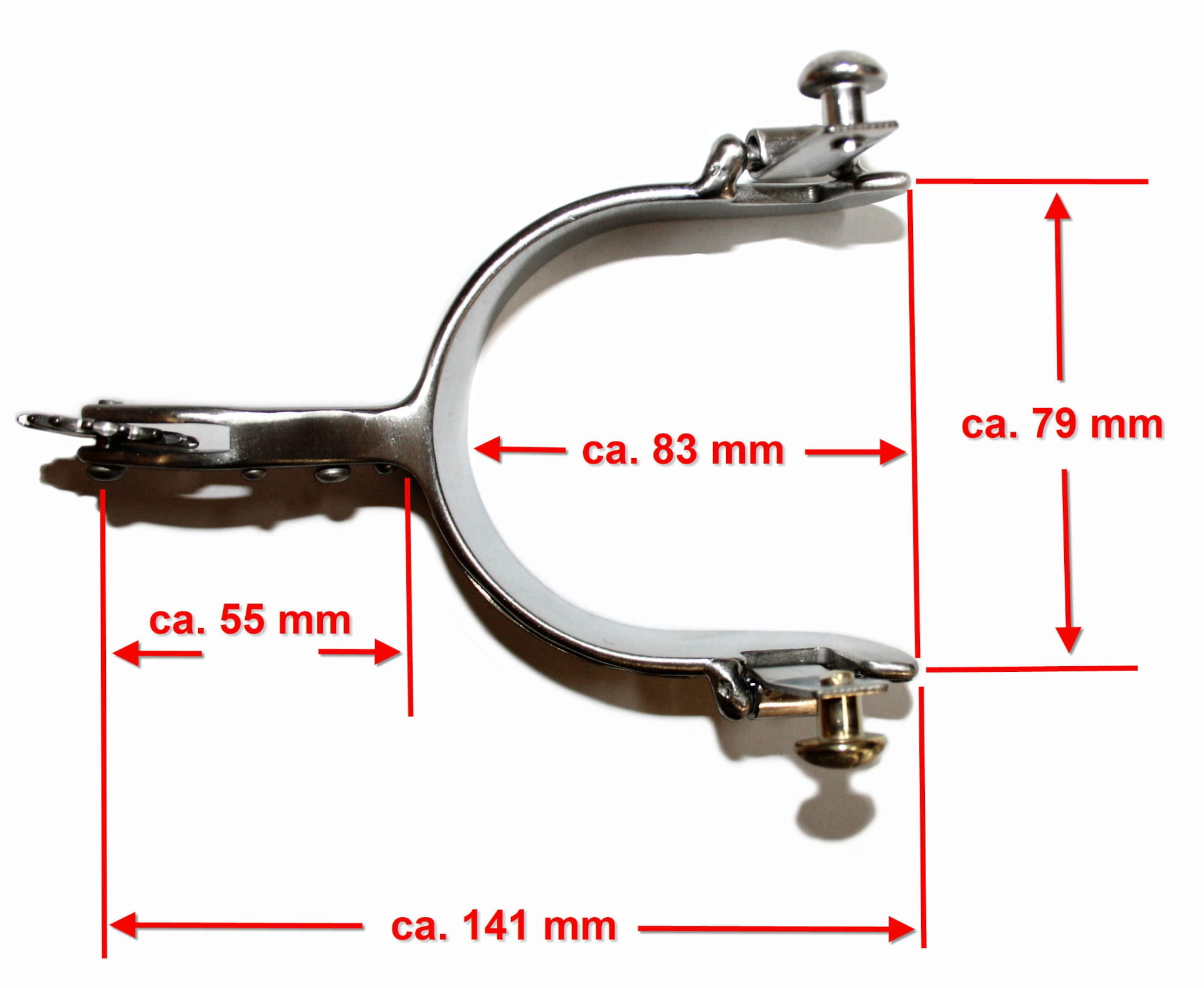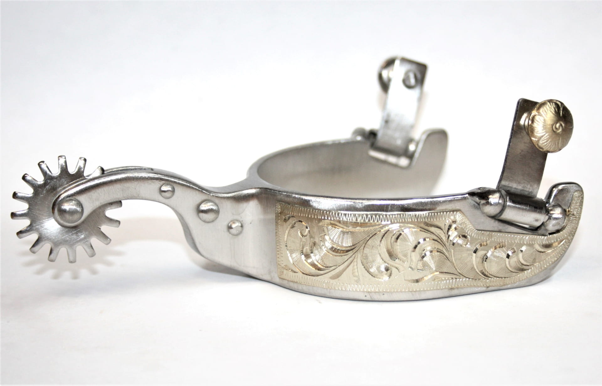 Schöne, schwere Edelstahl Sporen in brushed Optik mit gravierter German-Silver Flower-Applikation mit 16fachem Rädchen (Rock Grinder). Diese Sporen haben eine Schenkelweite/Öffnung von ca 7,9cm bei einer Höhe von ca 2,8cm. Das Rädchen ist geschweißt und lässt sich nur wechseln, wenn man dies aufflext und dann mit Splinten plus Achsen arbeitet. Der nach oben gebogene Sporenhals inkl Rädchen hat ca 7cm.