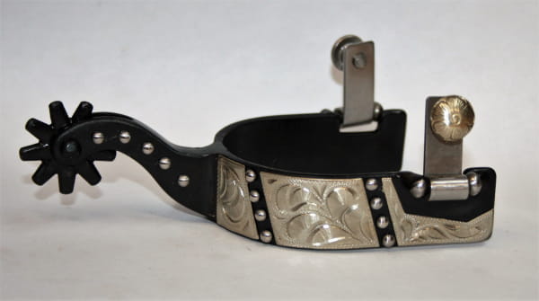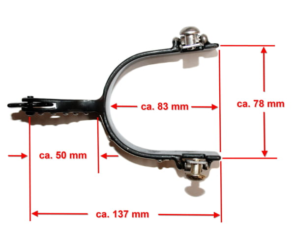 Sehr schicke schwere Westernsporen in black steel with silver trim für Männer. Das Sporenrädchen ist ein 9fach Rowel. Die Schenkelöffnung beträgt ca 7,8cm und die Länge des nach oben gebogenen Sporenhalses inkl Rädchen liegt bei ca 6,5cm. Das Rädchen ist geschweißt und lässt sich nur wechseln, wenn man dies aufflext und dann mit Splinten plus Achsen arbeitet.