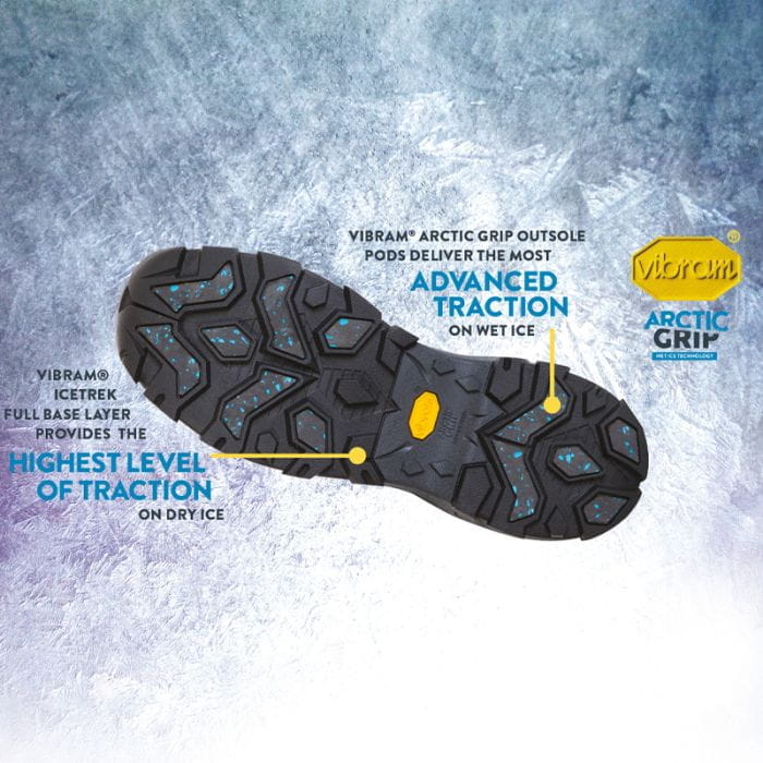 Vibram Arctic Grip ist eine Sohlentechnologie, die speziell für den Einsatz auf nassem Eis entwickelt wurde. Vibram Arctic Grip ist das fortschrittlichste Bodenhaftungssystem für kaltes Wetter, das Vibram jemals entwickelt hat. Die ICE Funktion innerhalb der Sohle sorgt für einen festen Sitz bei Eis und saugt sich am Boden fest.