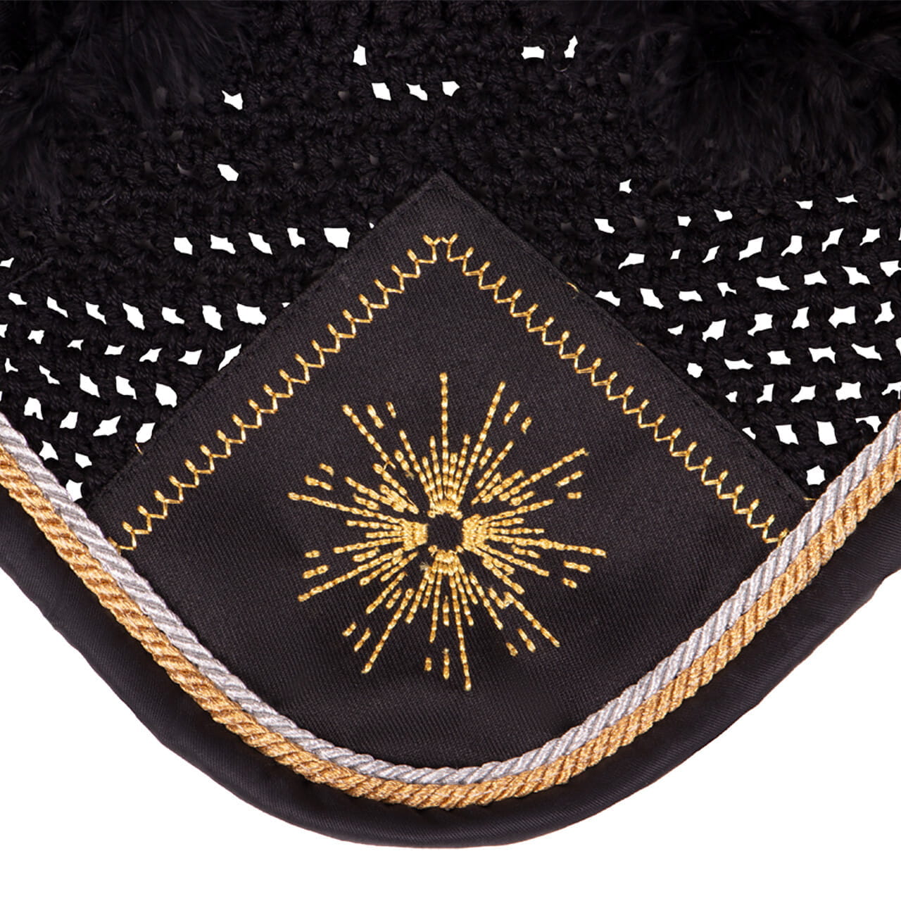 Schöne, gehäkelte Ohrenhaube in schwarz mit goldenen Details.