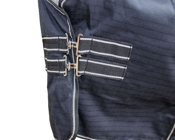 Kreuzgurte, Beinschnüre und Schweiflatz sorgen für einen sicher und guten Halt der Decke. Die Decke ist ohne zusätzliche Quer-Seitennaht und dadurch stabiler.