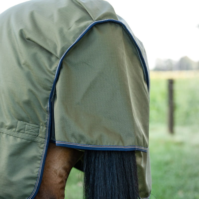Die Kavalkade Outdoordecke "Montreal" überzeugt durch ihre hervorragende Passform. Das Material besteht aus einem 1200 D Ripstop-Polyester Gewebe, mit folgenden Werten: 4000 mm Wassersäule, Atmungsaktivität 3000 g/qm in 24 h. Folgende Ausstattungsmerkmale runden die Decke ab: Möglichkeit der Verwendung von Beinschlaufen, tiefer Schweifriemen, großer Schweiflatz, Schlaufen zur Befestigung eines separat erhältlichen Halsteils, Kreuzgurte mit Elastikeinsatz, glattes Innenfutter, 2-facher Drehhaken-Brustverschluss mit zusätzlichem Klett.
