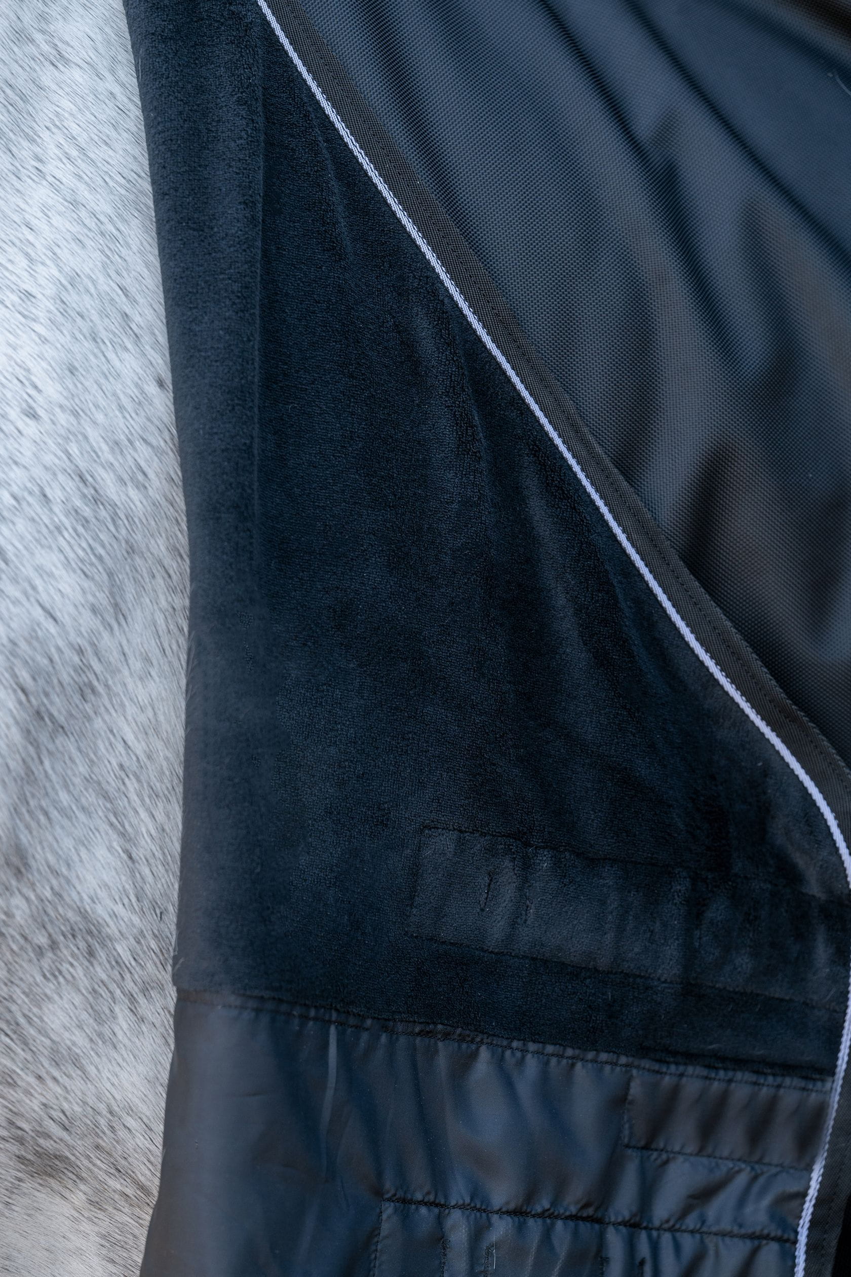 Diese Outdoordecke ist ein wahres Allround-Talent, das Ihr Pferd zuverlässig schützt. Sie ist wasserdicht, atmungsaktiv und winddicht, was bedeutet, dass Ihr Pferd trocken und geschützt bleibt, egal bei welchem Wetter. Mit einer Atmungsaktivität von 3.000 ml pro Quadratmeter pro 24 Stunden und einer Wassersäule von 3.000 mm bietet sie optimale Bedingungen. Sie ist auf der Unterseite mit kuscheligem Fleece ausgestattet. Die eingearbeiteten Gehfalten sorgen für Bewegungsfreiheit, während die Kreuzbegurtung, Beinschnüre und der Schweifriemen für einen sicheren Sitz sorgen. Reflektionsstreifen an den Seiten und am Schweiflatz erhöhen die Sichtbarkeit und somit die Sicherheit. Hergestellt aus extra weichem und robustem 1680D-Polyester, ist diese Decke sowohl langlebig als auch bequem für Ihr Pferd.