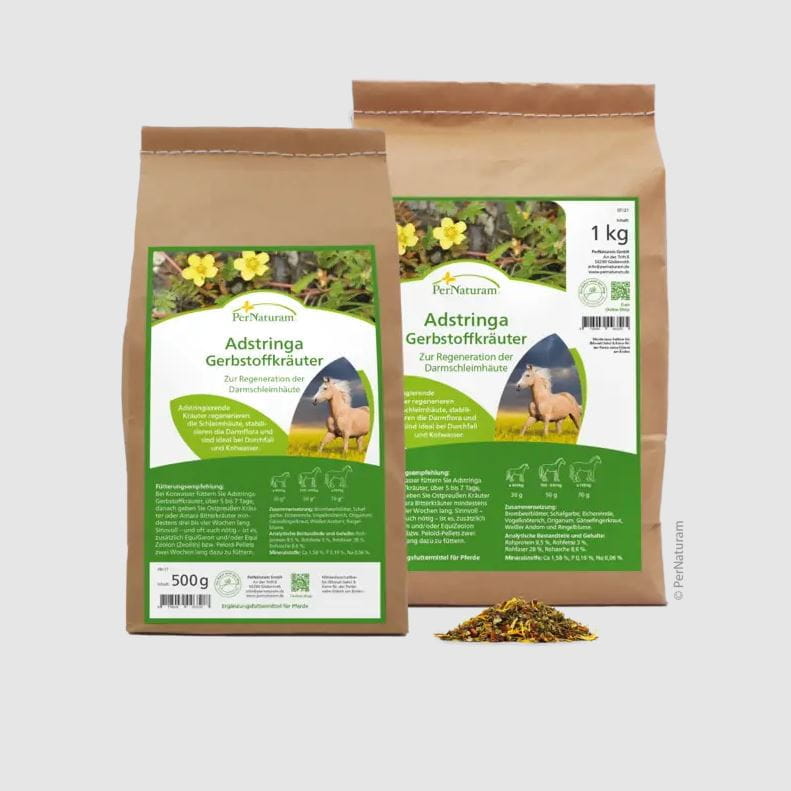 Füttern Sie für ein 600 kg schweres Pferd 50 bis 70 g Adstringa Gerbstoffkräuter über 5 bis 7 Tage. Danach geben Sie Amara Bitterkräuter drei bis 4 Wochen lang. Sinnvoll - und oft auch nötig - ist es, zusätzlich EquiGaron oder Peloid-Pellets von PerNaturam zwei Wochen lang zuzufüttern. Dann ist das Problem meist behoben. Die Darmschleimhaut hat sich normalisiert und die erwünschten Darmbakterien haben sich angesiedelt und vermehrt.