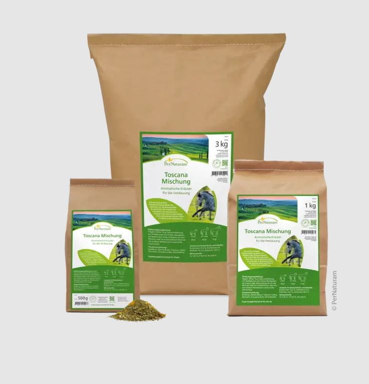 Täglich 30 bis 50 g Toscana Mischung von PerNaturam zum Futter dazugeben, am besten über einen Zeitraum von vier Wochen oder imwöchentlichen Wechsel mit anderen PerNaturam Kräutermischungen.