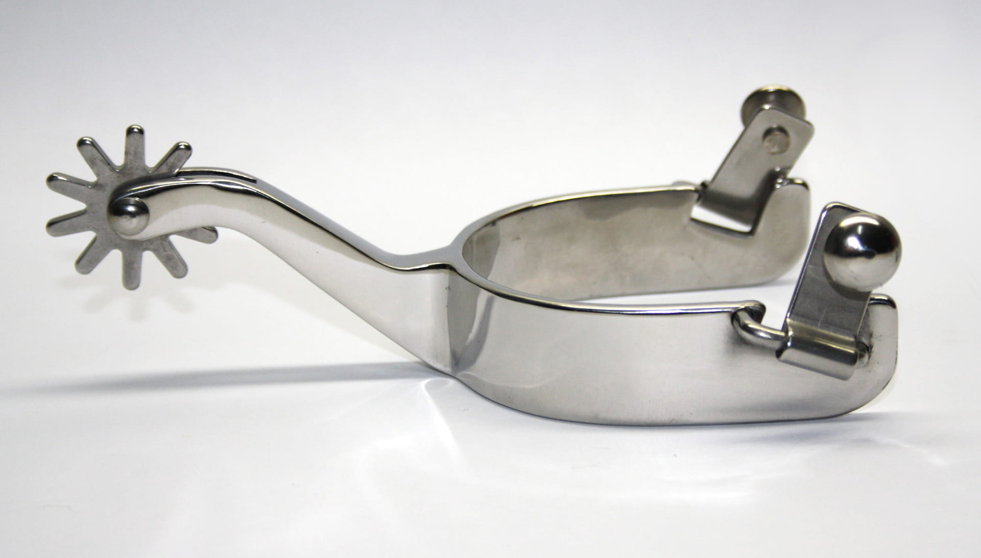 Das Sporenrädchen ist ein 10fach Rowel, der Dorn ist leicht nach oben gebogen.