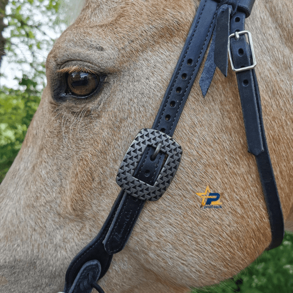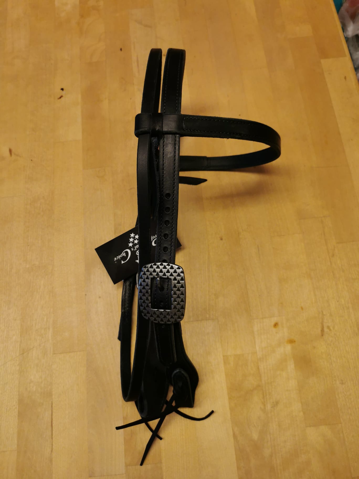 Dieses exklusive Kopfstück aus hochwertigem, schwarz gefärbtem Latigo-Leder wurde speziell für Profi-Tack gefertigt und ist nur bei uns erhältlich. Das klassische Browband-Design bietet nicht nur eine stabile Passform, sondern unterstreicht mit den edlen, strukturierten Schnallen auch den eleganten Look. Die Gebissbefestigung erfolgt traditionell über Latigo Ties – praktisch, langlebig und stilvoll zugleich.