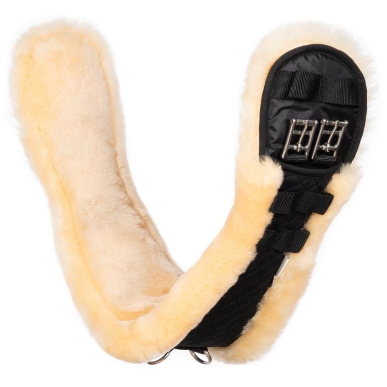 Dieser anatomisch geformte Lammfellsattelgurt aus der PT-Lammfell Line ist aus 100% Lammfell. Der schwarze Steppstoff ist aus strapazierfähiger Baumwolle und die Wollhöhe beträgt ca. 30 mm. Der Gurt verfügt über zwei Edelstahlschnallen ohne Schnellgurtung. Außerdem sind die Sattelgurte mit zwei D- Ringen zum befestigen von Hilfszügeln, Vorderzeug oder Martingal ausgestattet. Für einen optimalen Sitz haben die klassischen Lammfellkurzgurte der PT-Lammfell Line eine Führung aus Nylongurtmaterial für die Gurtstrippen des Englischsattels.