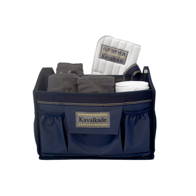 Die stabile Putztasche ist ideal für Putzzeug, Bandagen oder Pflegemittel. Damit auch kleinere Artikel nicht verloren gehen, hat die Tasche insgesamt neun unterschiedlich große Außenfächer, von denen zwei durch ein Klett geschlossen werden können. Getragen werden kann die Tasche entweder mit kurzen Henkeln oder einem langen Schulterhenkel. Letzteres kann auch abgenommen werden. Der Boden ist aus stabilem Netzmaterial, so das Schmutz und Haare im Inneren der Tasche keine Chance haben. Die Innenwände sind leicht zu reinigen und abwaschbar. Zum optimalen Verstauen ist die Putztasche faltbar.