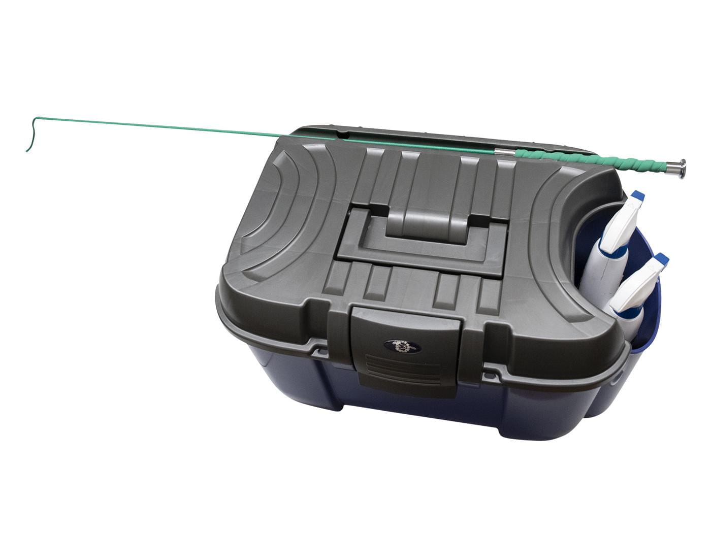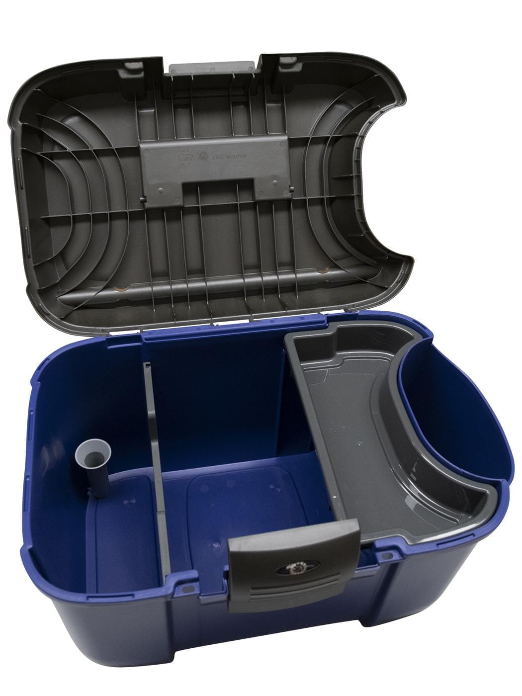 Die Koala Putzbox bietet ausreichend Platz für alle notwendigen Putzartikel Die stabile Kunststoffbox und ein leicht schließender Deckel stellen sicher, dass Ihr Putzzeug geschützt ist. Die Einteilung sorgt für gute Übersicht in der Putzbox. Das außenliegende Koala Flaschenfach bietet Platz hält große Flaschen aufrecht. Der Schlitz im Deckel dient zur Halterung einer Gerte. Die integrierte herausnehmbare Einlage sorgt für Ordnung für kleine Accessoires. Herausnehmbarer Pinselhalter. Auf dem verstärkten Deckel kann man sitzen bzw. bis 120kg! (265lbs) sogar stehen. Box kann mit Schloss gesichert werden