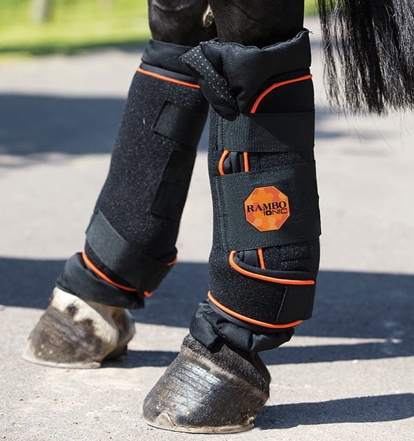 Die Rambo Ionic Gamaschen von Horseware können sowohl als Stallgamaschen oder als Transportgamaschen verwendet werden. Der Ionic Einsatz dient zur Förderung der Blutzirkulation, kann nach dem Training helfen die Milchsäure abzutransportieren, stimuliert den Stoffwechsel und verbessert die Zufuhr von Sauerstoff. Die Innenseite des herausnehmbaren Einsatzes ist mit Turmalin in Puderform besetzt, welcher negative Ionen freigibt. Diese negativen Ionen verändern die Wassermoleküle des Pferdes, welche dann die oben genannten Eigenschaften mit sich bringt. Die Gamaschen können sowohl für die Vorderbeine als auch die Hinterbeine benutzt werden. Die Außenseite der Gamaschen ist aus Neopren gefertigt und zudem auch atmungsaktiv. Die Gamaschen können auch ohne den Ionic Einsatz verwendet werden.