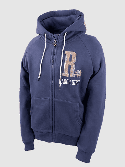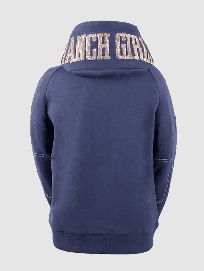 Ranchgirls Hooded Sweat Jacket SHINEY odyessey grey, besteht aus unserem bestem Sweatshirt Material, "der Dreifadenware", mit fein aufgerauter Innenseite. Der Raglan Schnitt lässt genug Bewegungsfreiheit zu und passt sich gut an, die Armlänge ist ideal für Western Reiter. Unser edles Paillettendesign auf der Kapuze und Brust, macht den Sweater besonders. Eine kleine Reißverschlusstasche, unterhalb der Kangootasche, lässt wichtige Dinge, wie zum Beispiel einen Autoschlüssel, beim Reiten sicher unterbringen.