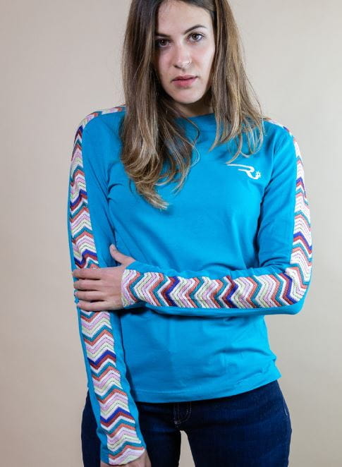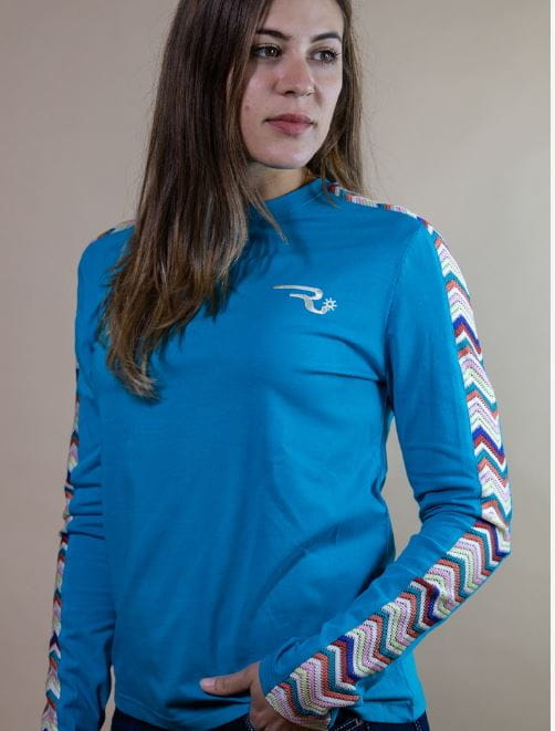 Das Branding ist schlicht auf der Brust vorne gestickt, in matter Ton in Ton Farbe. Das Longsleeve JOLIE ist in zwei Farben, mit diesem Retro-Stoff erhältlich und zwei weitere Farben, mit einem rosa farbigem Retro-Einsatz. Der Schnitt fällt der Größe entsprechend aus, z. B. EU 38 entspricht US M. Die hochwertige Jersey Qualität läuft nicht ein beim Waschen. Da sich andere Artikel, z. B. Reißverschlüsse in der Waschmaschine in das Western Langarm T-Shirt verhaken könnten, empfehlen wir eine Handwäsche oder Beutel Waschmaschinen Wäsche, um eine lange Haltbarkeit zu garantieren. Das Waschen nur mit anderen T-Shirts ist auch möglich, 20- 30C.
