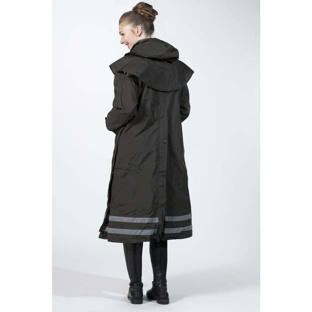 Funktioneller, wasser- und winddichter wattierter Mantel mit femininer Passform.Dieser Mantel hat ein sehr leichtes Tragegefühl und ist durch die warme Fütterung für winterliche Temperaturen geeignet.Der Mantel hat auf der Rückseite einen langen Schlitz mit Druckknöpfen und eignet sich daher ideal zu Reiten. Die Beine werden vom Mantel bedeckt und kühlen daher nicht so schnell aus.