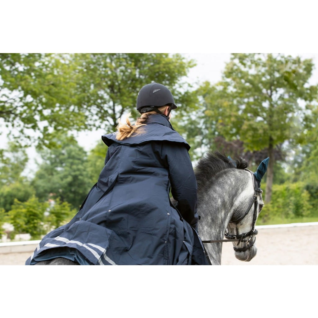Dieser speziell fürs Reiten entwickelte Regenponcho ist aus 100% Polyester und ist in einer Einheitsgröße erhältlich. Der Reit-Regenponcho hat Druckknöpfe an Halsöffnung und an den Seiten. Außerdem hat er eine großzügige Kapuze, die auch über den Helm gestülpt werden kann. Die Nähte dieses Ponchos sind abgeklebt und der Mantel hat eine PU-Beschichtung welche für 100 % Wasserdichte sorgt. Die speziellen Fußschlaufen verhindern ein Abheben des Ponchos während des Reitens.
