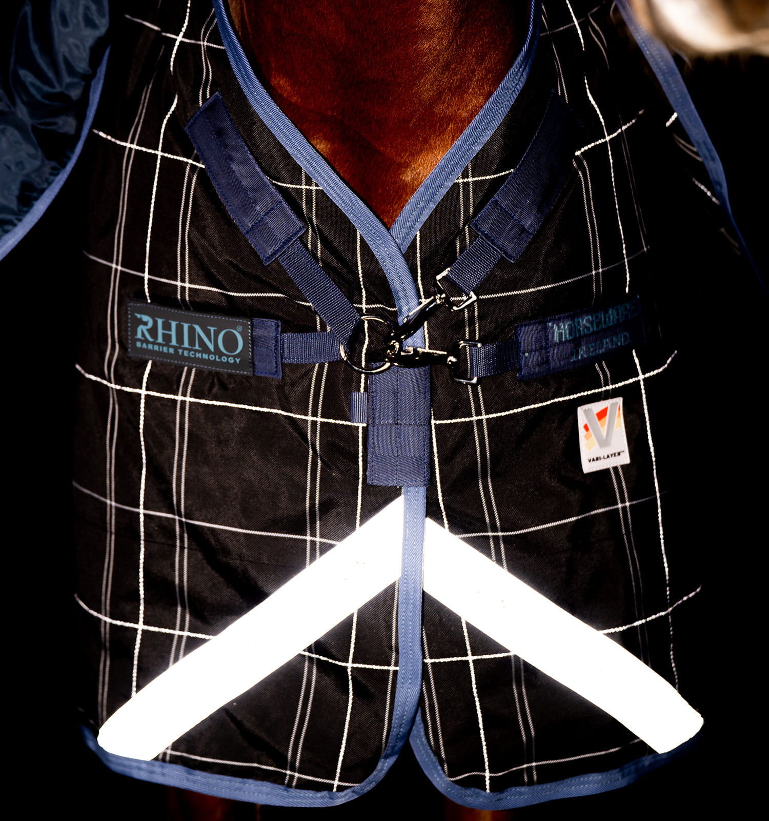 Die Weidedecke Rhino Plus Reflectech mit Vari-Layer-Technologie bietet mehr Wärme bei weniger Gewicht. Das eingewebte Garn reflektiert bei schlechten Lichtverhältnissen das Licht und sorgt so für zusätzliche Sicherheit. Dank der speziellen Anordnung der Füllschichten ist die Decke besonders warm – und gleichzeitig um 20 % leichter. Eine zusätzliche wasserundurchlässige Schicht im Inneren der Decke macht diese besonders wasserdicht und trotzdem atmungsaktiv. Ein abnehmbares Halsteil ist bei dieser Decke inklusive.