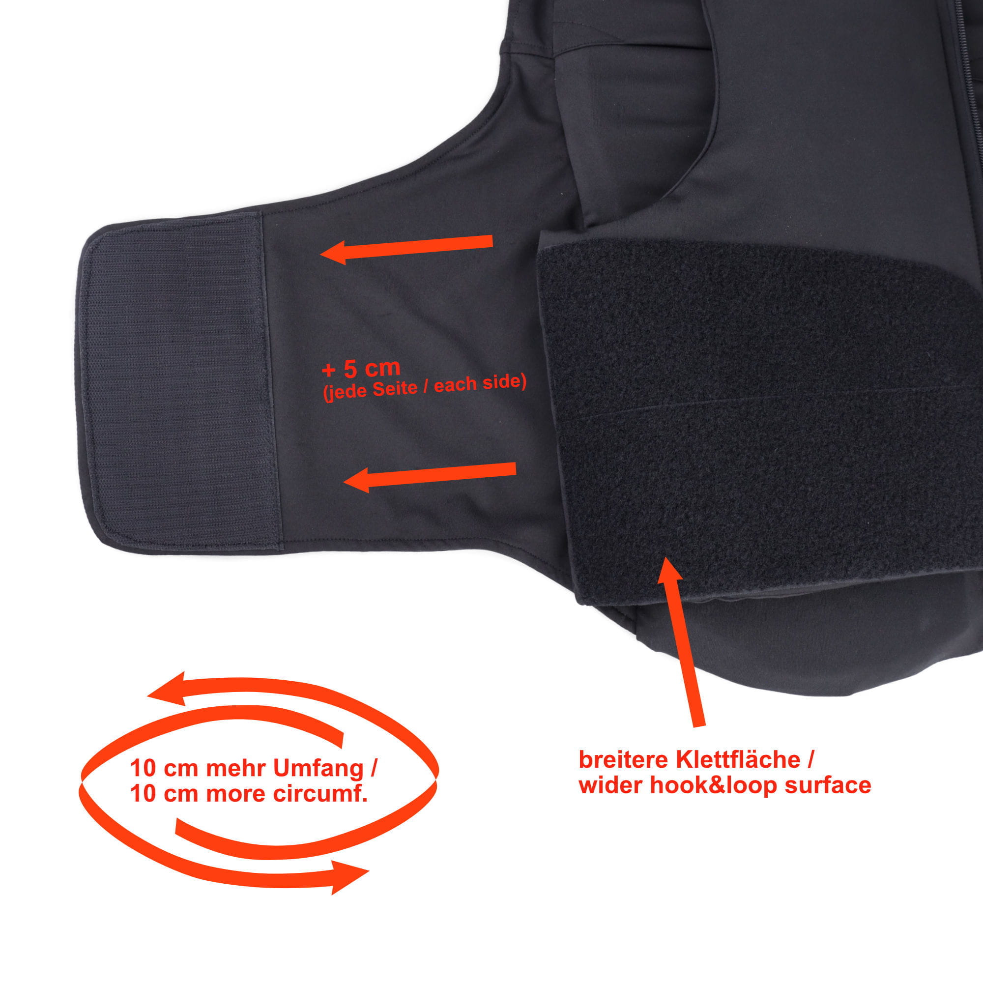 Der Precto Dynamic Fit Happy Size Rückenprotektor wird nun mit einem erweiterten Umfang von 10 cm angeboten, wodurch wir eine Zielgruppe abdecken möchten, die bisher im Bereich Sicherheit wenig berücksichtigt wird. Die zusätzlichen 5 cm auf beiden Seiten im Klettbereich bieten somit eine bessere Passform und dadurch mehr Komfort und Schutz für Anwender.