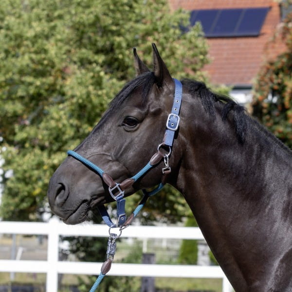 Das außergewöhnliche Seil-Halfter Dublin besteht aus einem weichen Seil, was an den Seiten und im Nasenbreich vernäht wurde. Mit einem weich gepolsterten Genickstück verleiht das Halfter einen guten Tragekomfort für das Pferd. Die Kunstlederabschlüsse sorgen zudem für einen besonders edlen Look. Verstellbar am Kinn- und zweifach am Genickriemen.