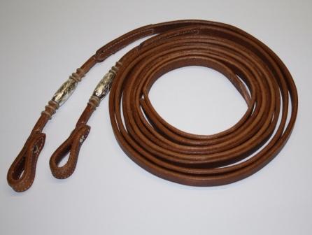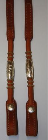 Die Harness Reins aus hochwertigem US-Leder sind ein absolutes Highlight für jeden Reiter. Mit einer Breite von 5/8' (14 mm) bieten sie optimalen Griff und liegen hervorragend in der Hand. Die wunderschönen Verzierungen mit Silver-Pipes und Rohhaut verleihen ihnen einen eleganten Look. Dank der Rounds End's lassen sie sich angenehm handhaben. Die Länge von 6' sorgt für ausreichend Spielraum. (Ca 1,80 Meter) Bitte achten Sie vor jeder Benutzung auf die Chicago-Schrauben, um eine sichere Verbindung zu gewährleisten.