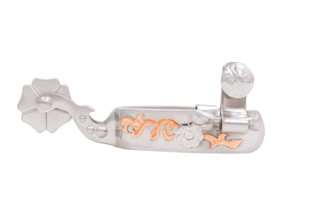Wunderschöne Show Sporen aus gebürstetem, mattem Edelstahl mit aufgelegten, gravierten Flowerstrukturen aus goldfarbenem Kupfer mit Crystal-Stone.