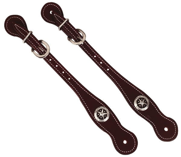 Schöne Sporenriemen aus Büffelleder mit weißen Nähten. Die Schnallen sind silber.