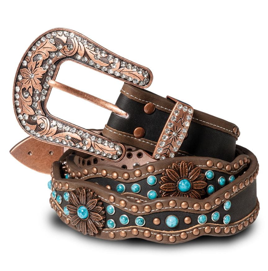 Westerngürtel mit dreiteiliger, austauschbarer Schließe. Hochwertig verarbeitet mit funkelnden Strasssteinen, Nieten und wunderschönen türkisen Steinen. Aus beschichtetem Rindersplitleder.
