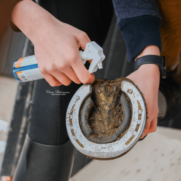 Anwendung: Die Unterkante des Hufes von außen und unten einsprühen. Kurz einwirken lassen. Das Pferd sollte möglichst auf trockenem Untergrund stehen. Für die tägliche Anwendung geeignet