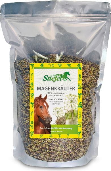 Stiefel Magenkräuter sind eine speziell ausgewählte, naturbelassene Kräutermischung zur Stabilisierung des Pferdemagens. Die Kräuter können die natürliche Funktion der Magenschleimhaut positiv beeinflussen, die Verdauung optimieren und eine normale Kotkonsistenz fördern.