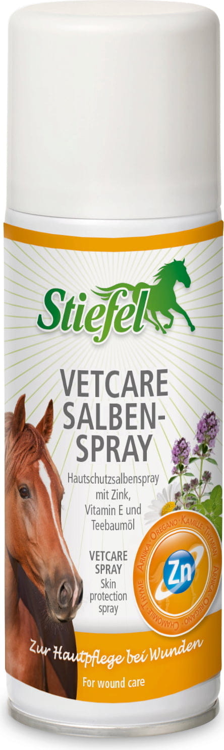 Stiefel Vetcare Salbenspray ist eine Hautpflege-Sprühsalbe für die erste Wundversorgung. Die ausgewählten pflanzlichen Inhaltsstoffe (Arnika, Oregano, Thymian, Kamille und Teebaumöl) in Verbindung mit Zink und Vitamin E können zu einer verbesserten Wundheilung beitragen. Stiefel Vetcare Salbenspray kann verletzte Haut beruhigen und pflegen. Das Hautschutzsalbenspray kann zudem entzündungshemmend und unterstützend bei der Behandlung von Mauke und Scheuerstellen wirken. Spannungsgefühle, Juckreiz und Scheuerneigung können gelindert werden.