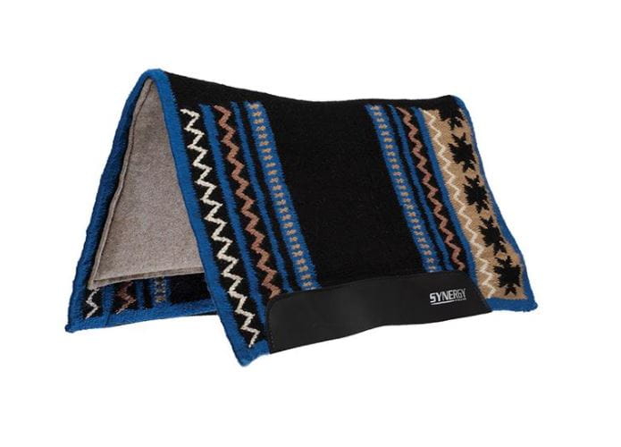 Die Synergy Pads von Weaver sind die idealen Allroundpads für den Alltag oder fürs Turnier. Diese Westernpads sind aus hochwertigem Wollfilz als Unterseite gefertigt, haben dann einen stoßabsorbierenden, atmungsaktiven und themperaturregulierenden EVA Schaum Inlay und oben drauf dann ein aus 100% Neuseelandwolle handgefertigtes Blanket vernäht. Das Showpad ist natürlich contoured geschnitten und passt sich der Rückenform des Pferdes perfekt an. Durch das breite, bereits geölte Lederrückenstück an der Wirbelsäule ist der Wirbelkanal am Pferderücken frei um eine ideale Luftzirkulation. Die Pads haben natürlich zum Schutz des Pads einen hochwertigen, bereits geölten Lederbesatz an der Gurtungsstelle.