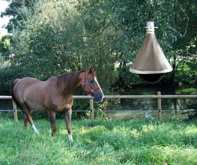 • Funktionsweise der Falle: Der Ball erwärmt sich und simuliert so für die Bremse ein Zielobjekt zum Blutsaugen. Nach dem erfolglosen Versuch der Blutaufnahme hebt das Insekt nach oben ab und erkennt als einzigen vermeintlichen Ausweg den Fangbehälter.