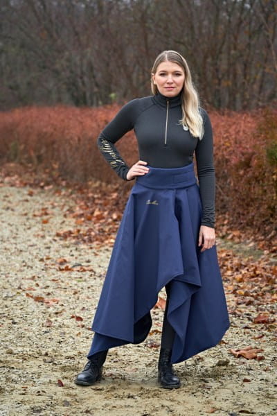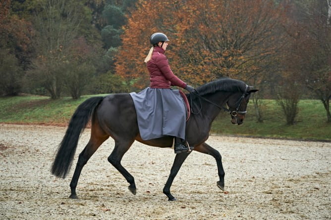 Entwickelt von Reiterinnen mit dem Ziel vor gefrorenen Beinen zu schützen. Der Thermorock schützt Reiter und Pferd vor dem Auskühlen.