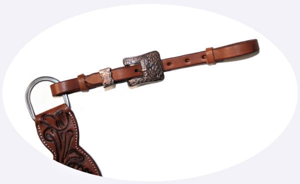 Wunderschönes Vorderzeug mit floralem Muster und Copper Schnalle. Dieses Vorderzeug hat die Größe Full und ist damit passend für alle im QH Typ stehenden Pferde. Der untere Steg zum Sattelgurt hat ca 60cm und die beiden Seitenteile haben ca 65cm in der mittleren Einstellung.