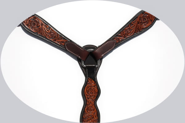 Wunderschönes Vorderzeug mit floralem zweifarbigen und Basket Muster in den Farben chestnut und dunkelbraun. Dieses Vorderzeug hat die Größe Full und ist damit passend für alle im QH Typ stehenden Pferde. Der untere Steg zum Sattelgurt hat ca 60cm und die beiden Seitenteile haben ca 65cm in der mittleren Einstellung.