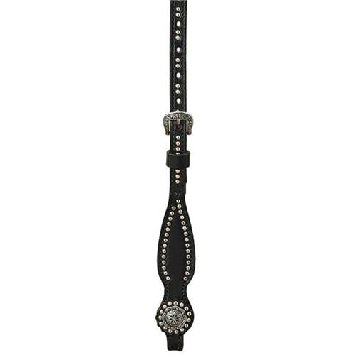Eine unserer beliebtesten Kollektionen, die Back in Black-Kollektion, ist in schwarzem Leder für einen authentischen Cowboy-Look erhältlich. Dieses doppelte und genähte 5/8" Premium-Kopfstück aus englischem Zaumleder hat einen einlagigen Kehlriemen und ein 1/2" Stirnband, das mit Nickel-Messing-Punkten akzentuiert ist. Die floralen Conchos und Schnallen aus Edelstahl von Horse Shoe Brand mit schwarzen Akzenten, entworfen von Jeremiah Watt, bieten den perfekten Western-Look. Nickel-Messing-Spots, doppelte Wangenverstellungen und rostfreie Edelstahlbeschläge runden dieses Kopfstück ab. Pferdegröße.