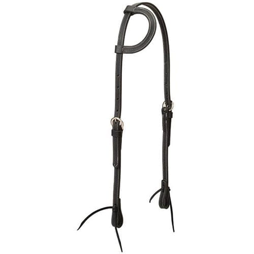 Dieses Einohr Kopfstück von Weaver ist Handgefertigt aus einlagigem 5/8" dicken und 100 % natürlichem, pflanzlich gegerbtem, heiß gestopftem Leder in klassischer schwarzer Farbe. Dieses Kopfstück verfügt über eine doppelte und genähte Ohrmuschel. Das flache, verschiebbare Ohr ermöglicht eine einfache Positionierung. Die Größenverstellbarkeit auf beiden Seiten sorgt für eine perfekte Passform. Schwarz Lederbänder an den Gebissenden Langlebige vernickelte Hardware. In der größten Einstellung von Gebissring zu Gebissring hat das Kopfstück ca 110cm. Die Gebissverschnallung erfolgt über Leder Bändchen.