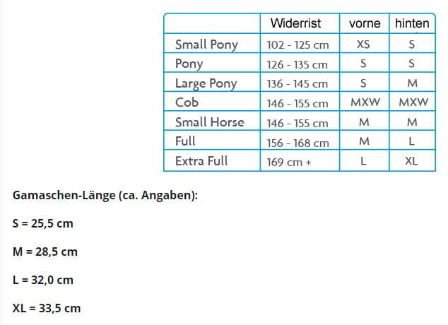 Wir empfehlen diese Gamaschen für im QH Typ stehende Pferde (~500kg) in Gr M. In den Bildern ist eine Größentabelle zu finden, mit derer man die Größe ganz leicht bestimmen kann.