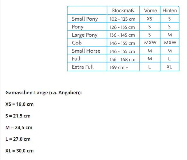 Extra leichtgewichtige Dressurgamaschen für höchste Ansprüche. Sie bieten einen Rundum-Schutz durch extrem Schlagabsorbierende und atmungsaktive EVA-Schaumschalen. Innen, und inklusive alle Kanten sind komplett mit extra dickem und fellfreundlichem Kunstfell abgepolstert. Ein super einfaches Handling durch den extra starken Einfach-Klett. Sie sind maschinenwaschbar und schnell trocknend. Je nach Größe sorgen zwei bzw. drei Klettverschlüsse für einen optimalen Halt. Die Gamaschen sind für vorne und hinten geeignet, für hinten sollte man in der Regel eine Nummer größer wählen als vorne.